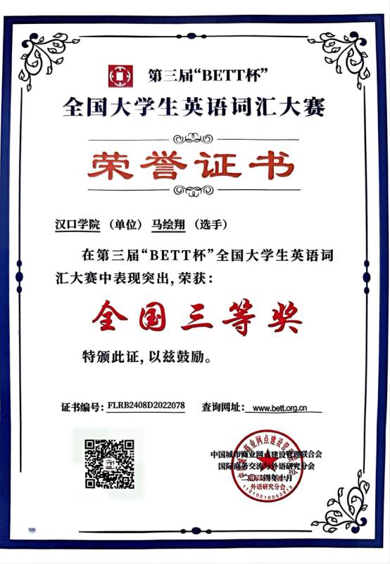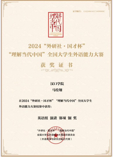 “自信人生二百年,会当水击三千里。”竞赛舞台是马绘翔挑战自我、追逐卓越的战场。在第三届“BETT”杯全国大学生英语词汇大赛中,她凭借扎实的英语功底脱颖而出,斩获全国二等奖;在第十一届全国大学生能源经济学术创意大赛里,与团队并肩作战,荣获省级二等奖;在“外研社·国才杯”“理解当代中国”全国大学生外语能力大赛英语组笔译和演讲比赛中,以出色表现赢得银奖和铜奖。每一次竞赛,她都勇敢亮剑,在挑战中突破自我,用实力书写着属于自己的荣耀,如一颗闪耀的星辰,在竞赛的天空中熠熠生辉。