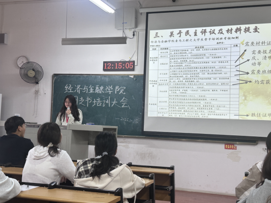 为全面提升团干部履职能力,夯实基层团组织建设根基,强化青年思想引领效能,经济与金融学院于2025年10月15日中午12点,在2507教室顺利召开团支书专题培训大会。本次会议由学院学生副书记付雨馨主持,24级、25级各班团支书全员参会。