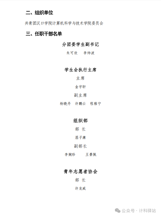 参加本次大会的领导和嘉宾有计算机科学与技术学院党总支书记郭浩平同志、分团委书记吴聪颖老师、第二十一届主席团成员及各部门部长、第二十二届主席团成员、各部门部长及干事。