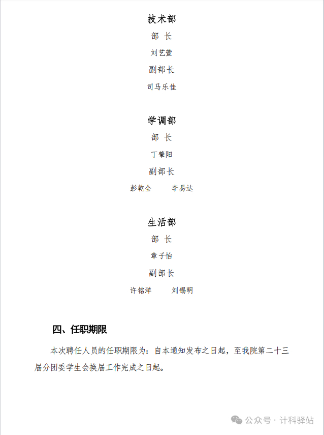 分团委书记吴聪颖老师宣布根据相关规定,经个人申报、资格审查、面试考核、结果公示等相关程序,确定分团委学生副书记为朱可欣同学、李帅波同学,学生会执行主席金宇轩同学,学生会执行副主席为杨晓丹同学、许鹏云同学、程雅宁同学。接着宣读了第二十二届各部门部长任命名单。吴聪颖老师对即将接过接力棒的第二十二届分团委学生会成员寄予厚望,并提出了对他们在未来工作岗位中的相关要求。