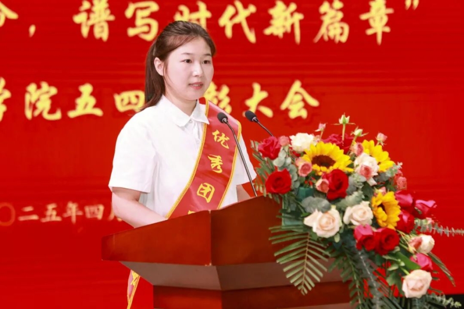 优秀共青团员标兵代表陶倾同学发言,分享了自己在学习、班级团支书工作和志愿服务中的经历。她强调要以五四精神为指引,通过科研竞赛、红色教育、志愿服务等活动,不断提升自我、奉献社会,呼吁新时代青年以奋斗书写青春,传承五四精神,为祖国建设贡献力量。
