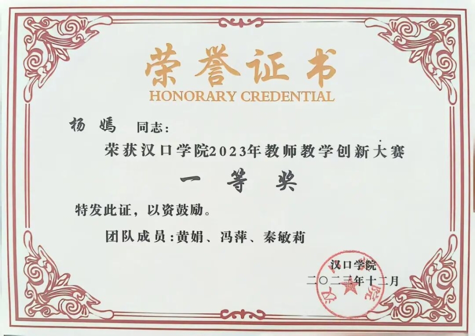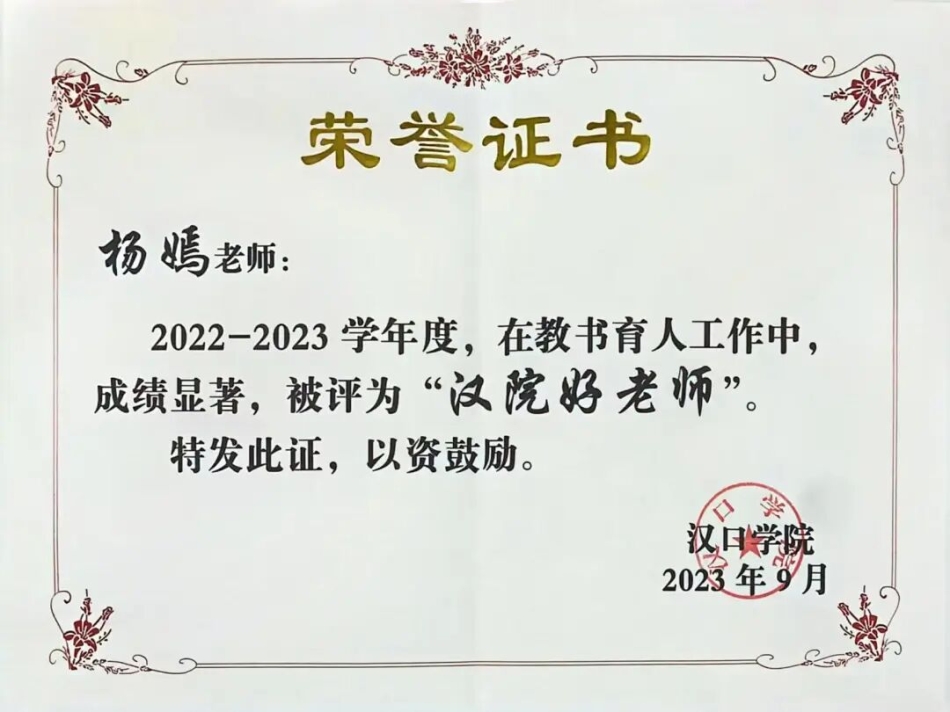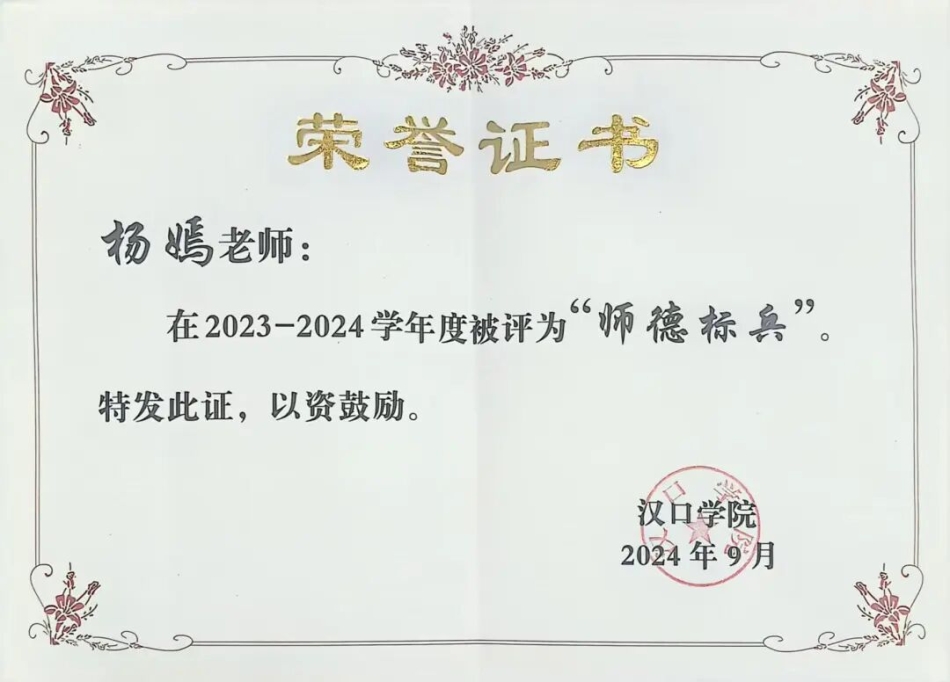 杨嫣老师始终将教学视为核心使命,她凭借出色的教学能力,多次荣获“课堂教育质量优秀奖”等荣誉,在教学考核中也屡获“优秀”。
