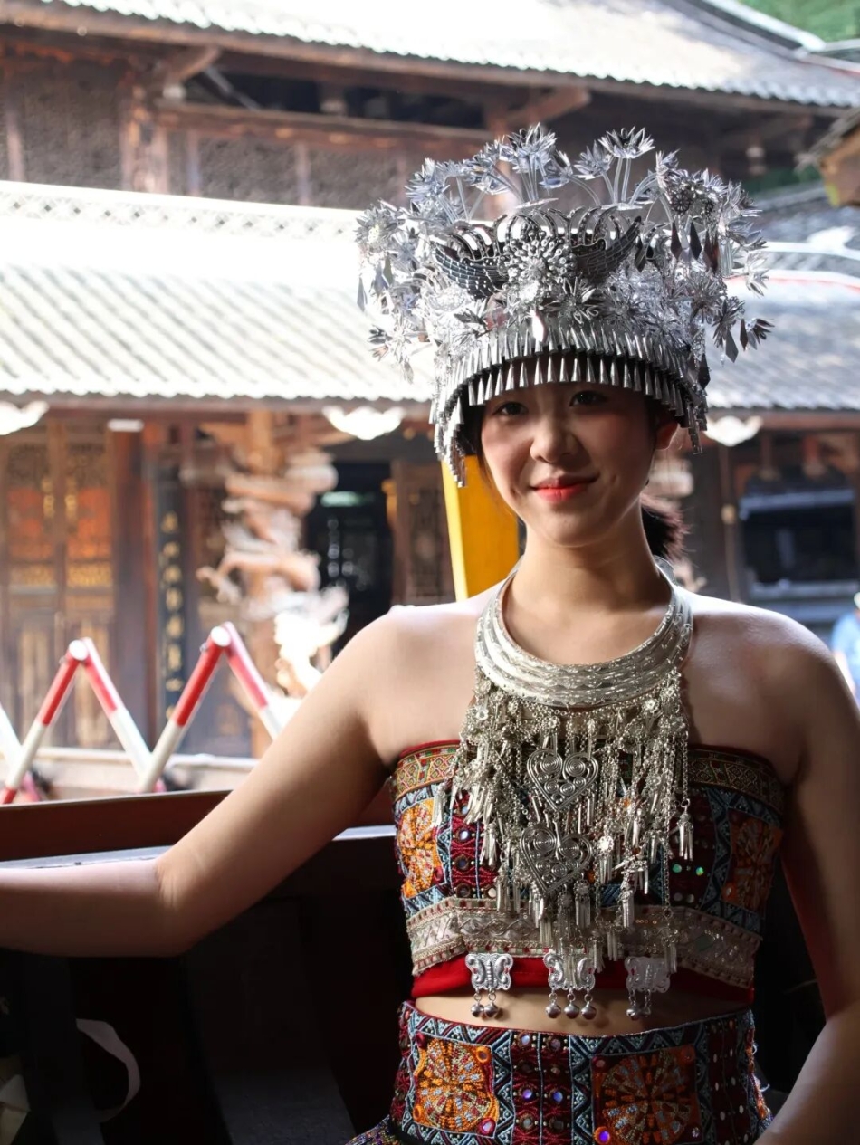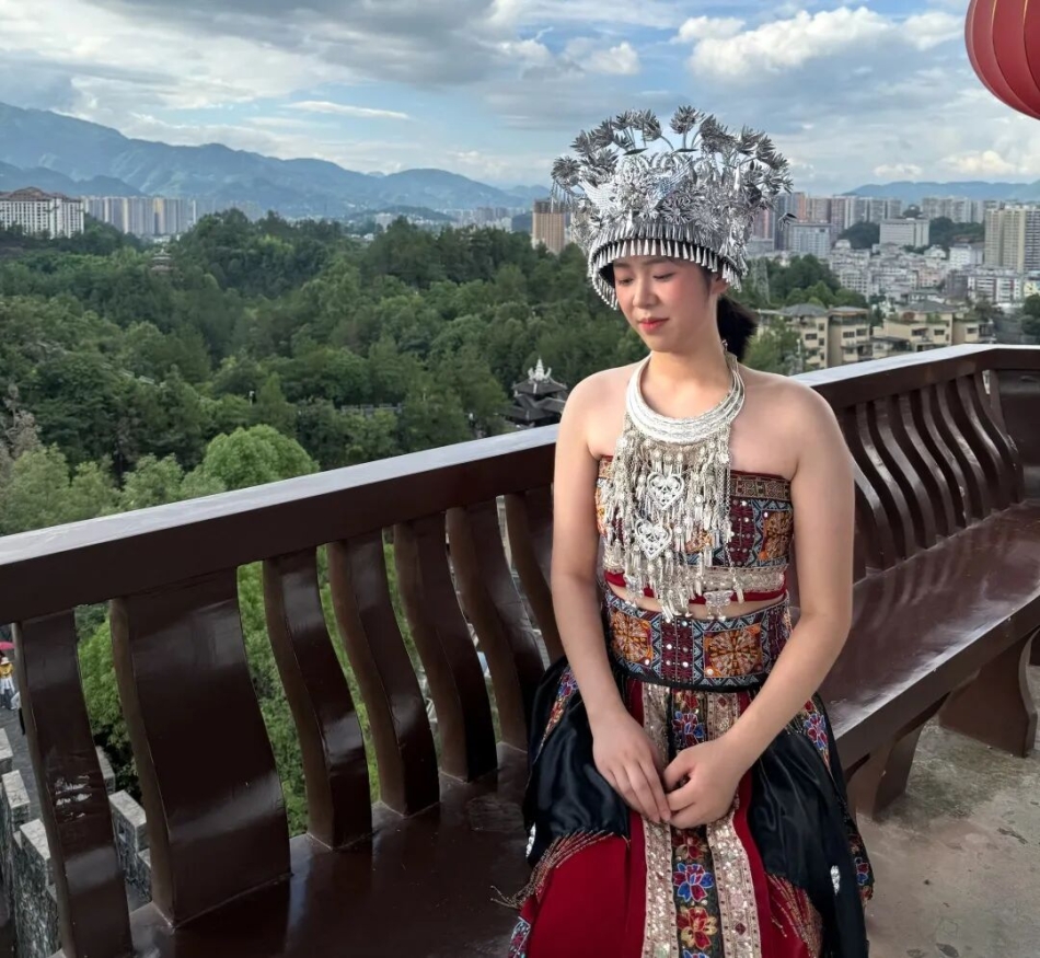 下午,队员身着苗族特色服饰,深入感受服饰文化。苗族服饰以繁复的针法、神秘的纹样与震撼的银饰闻名,被誉为“无字史书”。其造型多达170余种,对应不同支系迁徙记忆:黔东南“黑苗”尚玄色重银饰,黔中“花苗”擅蜡染,滇南“白苗”以麻绣纪事,一针一线皆藏族群密码。苗族服饰不仅是美学符号,更是镌刻战争、信仰与自然的立体史册,以视觉语言守护着中华多元文化的瑰丽基因。