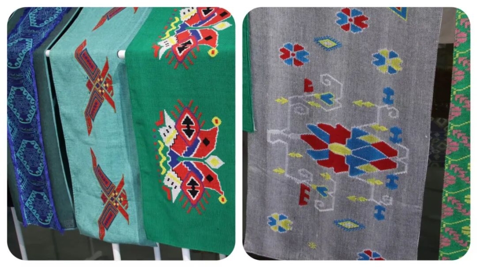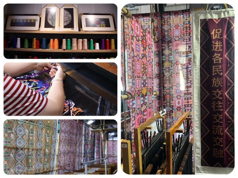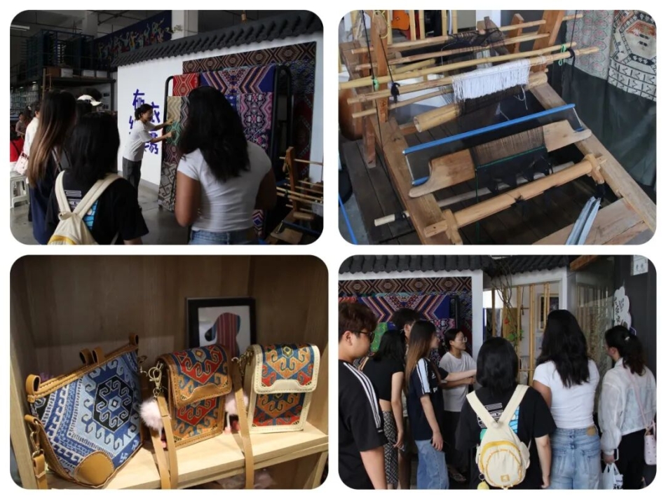 西兰卡普意为“花铺盖”,又名土家织锦,是恩施地区的民间传统手工织锦,2006年,被列入首批国家级非物质文化遗产名录。西兰卡普是在木制斜腰织机上经断纬采用通反面挑织的方法制成。其色彩艳丽、图案题材广泛涵盖了当地人民生产生活的方方面面,是恩施各族儿女集体智慧的结晶是中华民族多元文化交融的生动体现。2025年7月3日,我们来到了西兰卡普生产基地,走进基地的工坊,一股混合着木头、棉线和淡淡染料的味道扑面而来。传承人很热情,招呼我们围在一架看起来很有年头的腰织机旁边,详细地为我们讲解腰织机的历史与使用方法。基地陈列的现代创新作品将传统"岩墙花"纹样应用于手提包设计,既保留了文化基因,又符合当代审美需求,正如传承人所言:"保护非遗不是将文物锁进博物馆,而是要让古老智慧持续参与现代生活。"