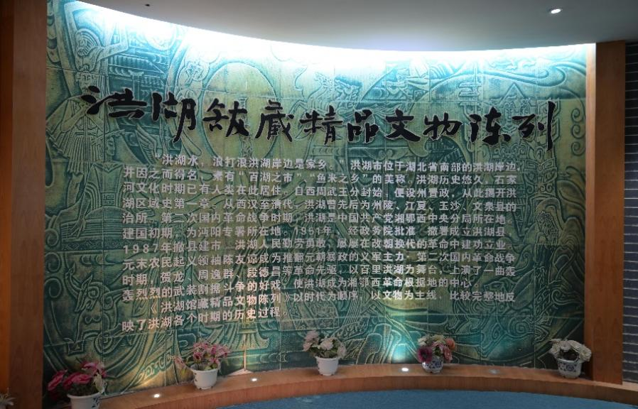 洪湖市博物馆基本陈列为“洪湖馆藏精品文物陈列”,展览面积为700平方米。展览分文明曙光、州陵风韵、文泉华彩、洪湖烽火四个部分,共展出文物101件,主要是以时代为顺序、以文物为主线,通过实物、照片、图表、油画、场景等多种手段,比较完整地反映了洪湖各个时期的历史发展过程。
