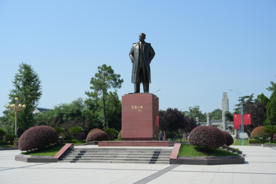 踏入陵园,青年路尽头矗立着四柱三间式牌坊,绿瓦朱楹、飞檐斗拱间,原国家主席李先念题写的“湘鄂西苏区革命烈士陵园”园名苍劲夺目。牌坊后方,贺龙元帅全身铜像巍然挺立——这尊由中国人民革命军事博物馆设计的雕塑,正以目光守护着他曾浴血奋战的土地,纪念着他诞辰百年的不朽荣光。