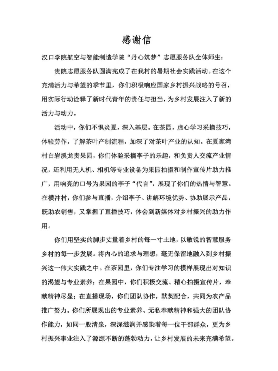 在暑期社会实践圆满结束后,宜昌市宜都市王家畈镇夏家湾村向航空与智能制造学院传来饱含深情的感谢信,对航空与智能制造院志愿服务队在此次实践活动中展现的卓越风采给予高度赞誉。服务队成员们秉持着无私奉献的志愿精神,以青春的热忱与担当,深入乡村基层,为乡村发展添砖加瓦,用实际行动诠释了新时代青年的责任与使命,彰显了汉院学子扎根基层、服务社会的青春风