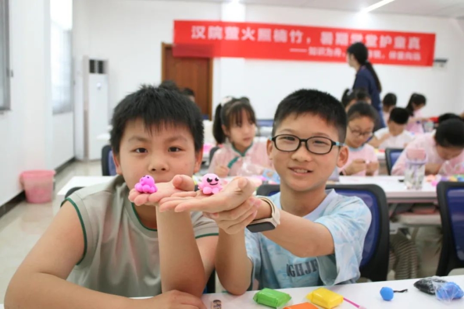 手工与艺术课程则充满乐趣:黏土捏塑、扭扭棒创作锻炼动手能力,释放创意;课桌舞在律动中焕发活力;绘画课用色彩描绘心中世界。