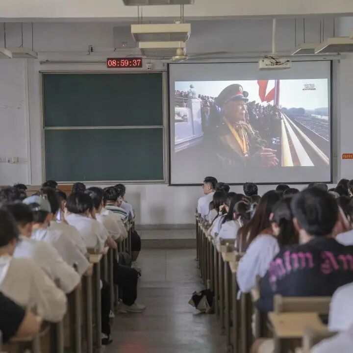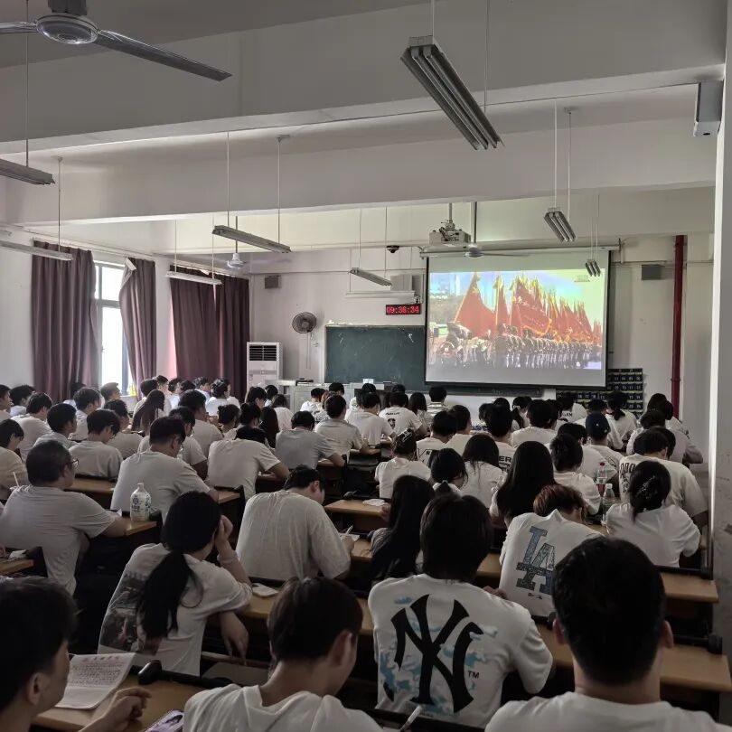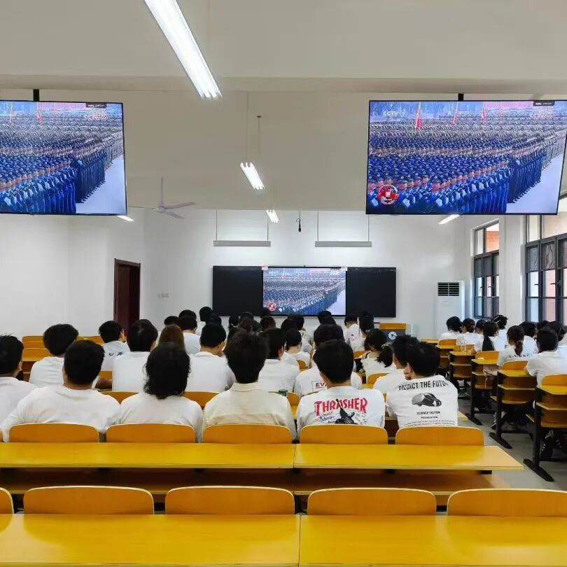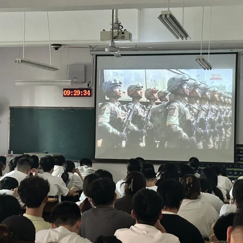 军歌嘹亮,步伐铿锵。三军列阵、装备巡天,每一个画面都让同学们感受到祖国的强大。战机掠空、战车稳步,每一次亮相都激起全场自豪之情。同学们神情专注,不时低声交流,浓烈的爱国情怀在教室中澎湃涌动。