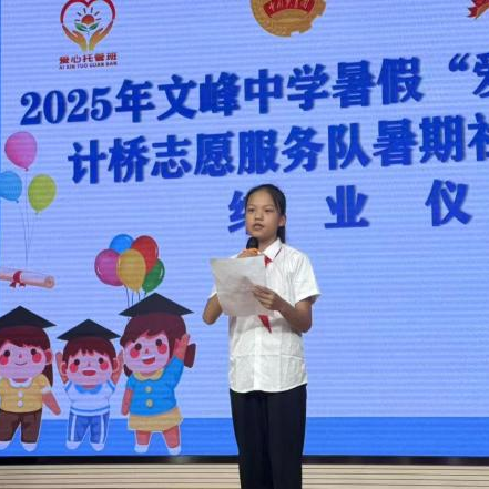 在这个夏天,计桥志愿服务队与文峰中学的同学们一同成长、一同进步。虽然结业仪式已经结束,但这段美好的回忆将永远留在大家的心中。愿同学们在未来的日子里,带着这份收获与感动,勇敢地迈向新的征程,书写属于自己的精彩篇章。