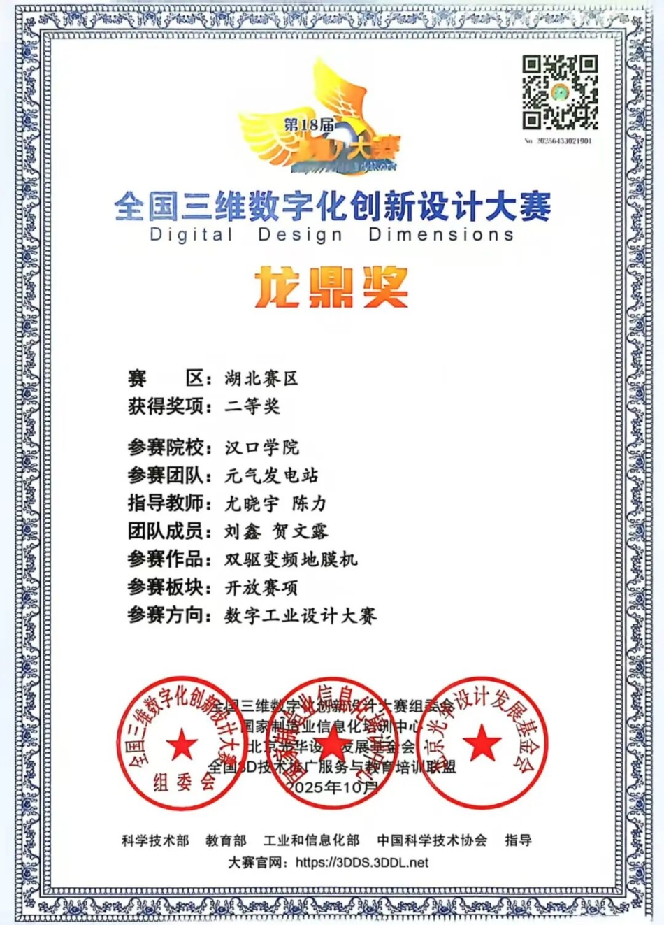 10月19日,为期两天的第18届全国三维数字化创新设计大赛(简称“全国3D大赛”)湖北省赛在天门职业学院圆满落幕。本届大赛以“数智融合·创见未来”为主题,吸引了全省众多高校学子的激烈角逐。其中,汉口学院航空与智能制造学院在徐先勇院长的带领下,派出的2个参赛团队全部载誉归来,展现了其在新一代数字技术教育与创新实践培养上的雄厚实力。