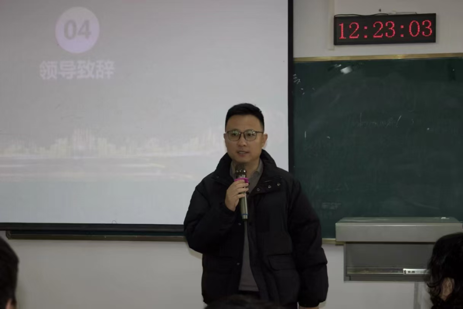 田鹏书记上台致辞,他首先对分团委学生会本学期的工作给予了高度肯定。田鹏书记指出,在过去的一学期里,学院团学组织围绕学风建设、校园文化、服务同学等核心工作,开展了学习笔记大赛、辩论赛、寝室文化节等一系列特色活动,成效显著。同时,他也对同学们提出了殷切期望,鼓励大家以先进为榜样,在学习中锤炼本领,在实践中增长才干,在青春的赛道上奋力奔跑。
