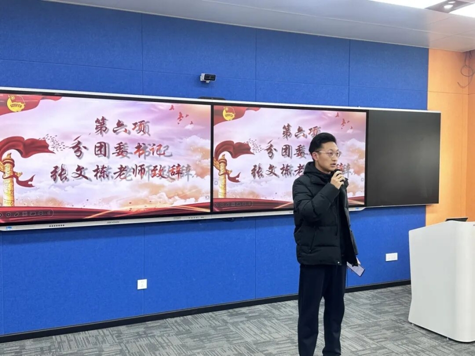 接下来是分团委书记张文栋致辞。他首先向全体新团员致以诚挚的祝贺,随后带领团员们回顾了共青团的光辉历程,勉励学院共青团员筑牢信仰之基、锤炼过硬本领、彰显青春担当。他嘱咐同学们牢记入团初心、勇担时代重任,在青春的赛道上奋力奔跑,在成长的征程中锤炼本领,让青春在为祖国、为人民的奉献中绽放绚丽之花。