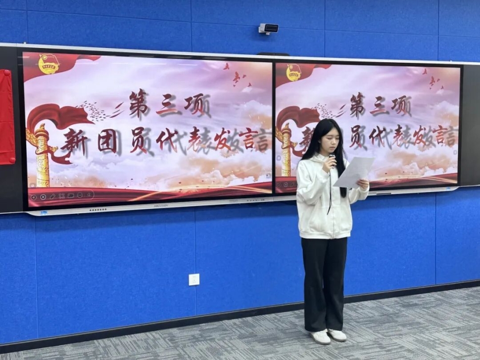 新团员代表周钰琪同学上台发言,字里行间满是激动与热忱。她分享了自己对共青团的深刻认知与长久向往,细数了追逐信仰过程中的点滴感悟,并以青春的名义郑重承诺:今后将以团员标准严格约束自我,在学习中勤学善思、在生活中严于律己,努力成长为有理想、敢担当、能吃苦、肯奋斗的新时代大学生,用实际行动为团组织增光添彩。