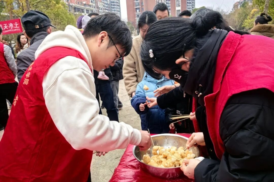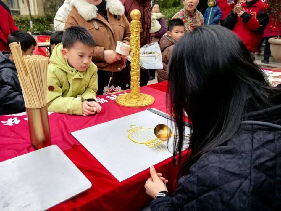 刚出锅的欢喜坨金黄酥脆,咬上一口满是香甜;非遗糖画艺人手腕翻飞,糖浆在石板上勾勒出龙、凤、小兔子等栩栩如生的造型,引得孩子们争相围观;一碗碗热气腾腾的汤圆端上餐桌,志愿者们将这份甜蜜亲手送到居民手中,一口甜汤,暖了胃,更暖了心。